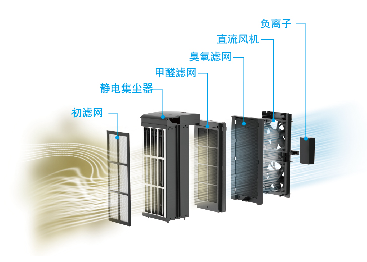 高性能直流风机,节能降耗,持久耐用 静音工作,宁静舒适 等离子静电集尘器,清洗方便,无需更换 超大风量快速循环净化空气 有效去除PM2.5以及小至0.1-0.3微米的细微颗粒 负离子活性氧迅速消烟除臭,空气更清新 高压静电有效抑菌消毒 多重专业滤网,高效去除甲醛、苯等有毒有害气体