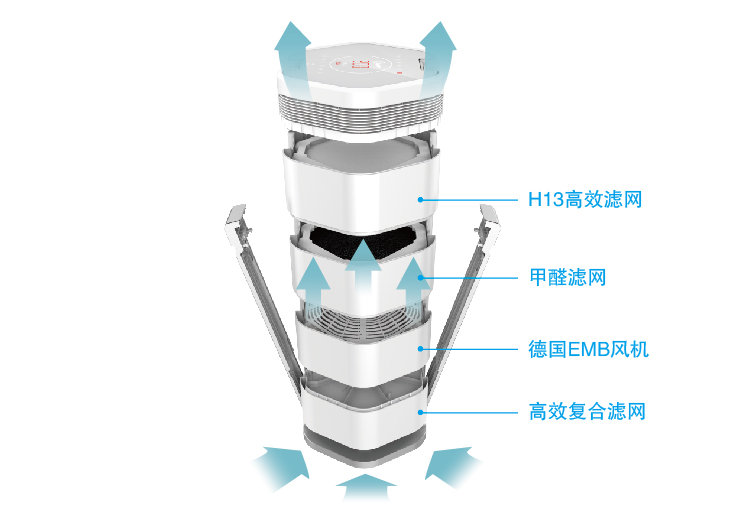 高性能德国EBM风机,节能高效,持久耐用 内置智能传感器,自动感应并检测空气质量 清晰的PM1.0,PM2.5和PM10数值显示,更好的了解空气质量 多重进风设计有效增加进风量,快速循环净化空气 方便的WIFI功能,让用户可以使用手机APP监控室内空气和远程遥控机器 医疗级HEPA滤网(H13等级)有效去除PM2.5以及小至0.3微米的细微颗粒 出风口可实现“零PM2.5” 负离子和活性炭迅速消烟除臭,空气更清新