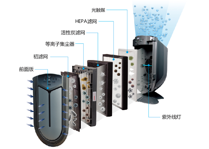 高性能直流风机,节能降耗,持久耐用 静音模式,宁静舒适 内置智能传感器,自动感应并检测空气质量 等离子静电集尘器,清洗方便,无需更换 超大风量快速循环净化空气 4级空气质量指示,清晰显示空气质量级别 高效HEPA滤芯,滤除小至0.3微米的细微颗粒 UV灯有效抑菌消毒 多重专业滤网,高效去除甲醛、苯等有毒有害气体 遥控操作,多种运行模式选择 负离子活性氧迅速消烟除臭,空气更清新